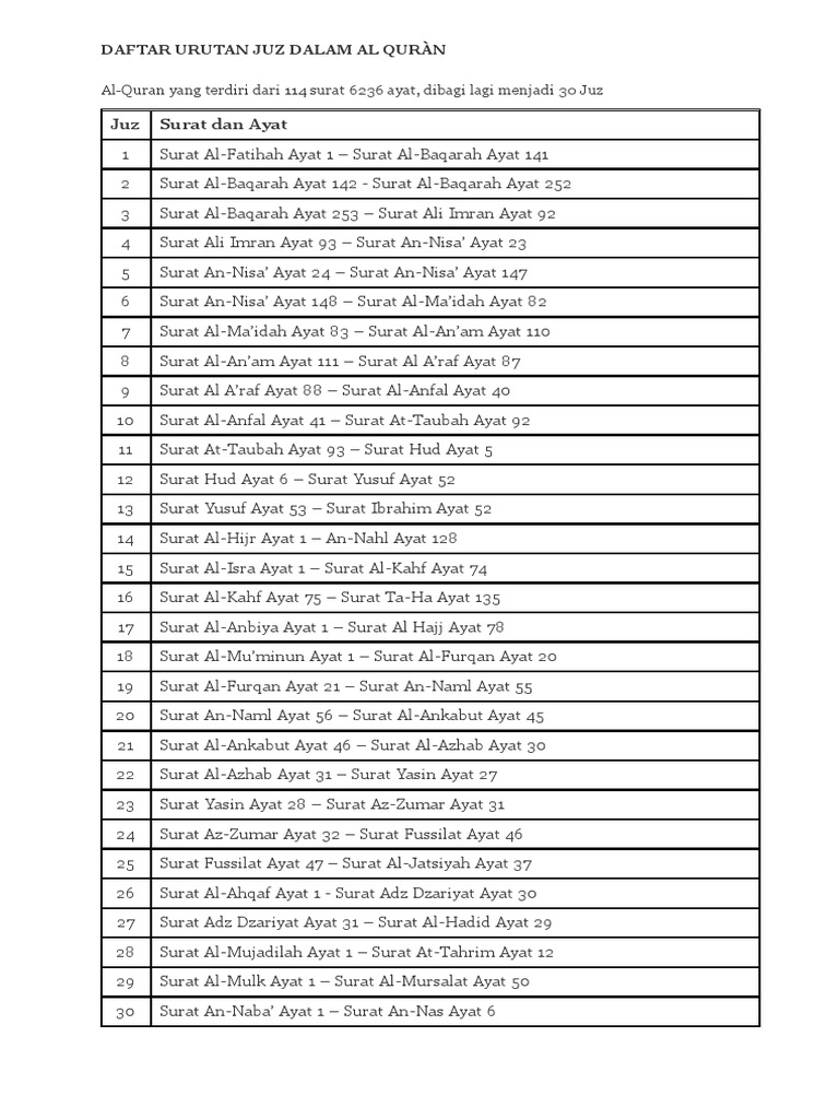 Daftar Urutan Juz Dalam Al Quran Pdf